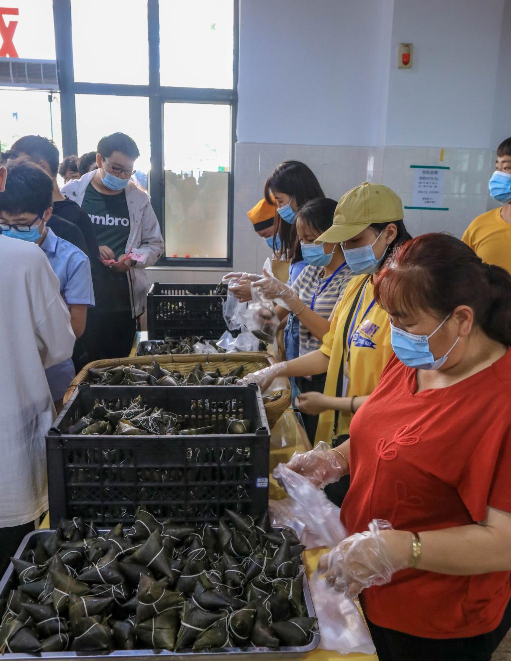 今天,在粽香弥漫的食堂品馨园里,同学们和各位工作人员在欢声笑语之中收到来自公司的“关爱”——粽子。食堂桌上粽子的粽叶青翠欲滴,散发着沁人心脾的清香,令人垂涎。