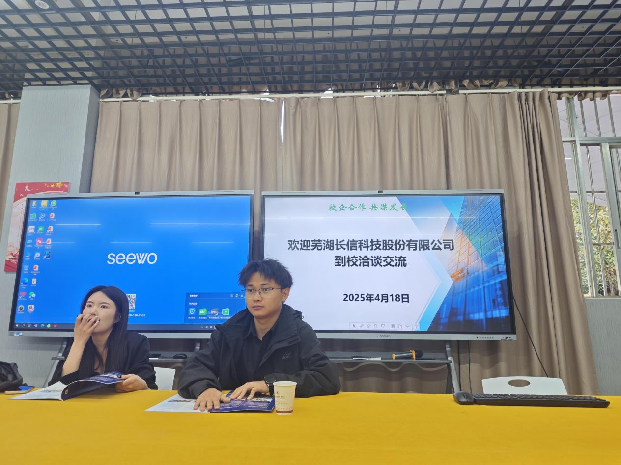 4月18日,太阳成tyc122cc与芜湖长信科技股份有限公司举办校企合作洽谈交流会。公司副经理李忠岘、郭欣,就业专员布鹏、刘宸玮,以及企业人事组长穆春平、副组长张倩、副主管冯云宝,就2025年实习就业工作展开深度对接。双方通过数据复盘、经验总结与前瞻规划,在人才共育机制建设方面达成多项共识。