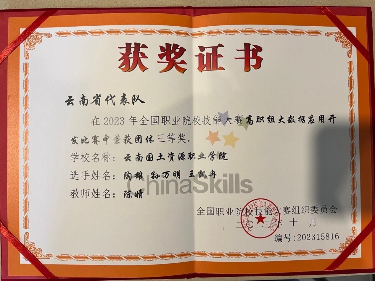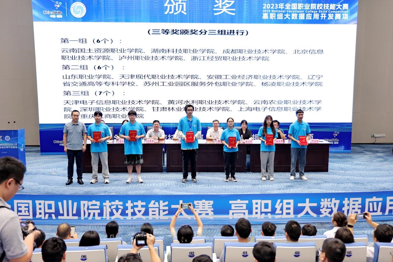 10月22日-24日,2023年全国职业院校技能大赛高职组“大数据应用开发”赛项在海南省琼海市海南软件职业公司成功举办。在公司教务处长郑毅、太阳成tyc122cc经理任友理的率领下,由教师陈婧及员工陶雄、孙万明、王凯冉组成的师生同赛代表队表现出色,荣获了三等奖的佳绩。