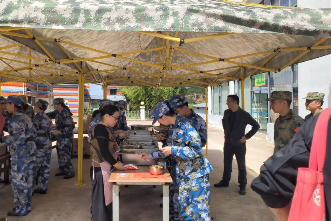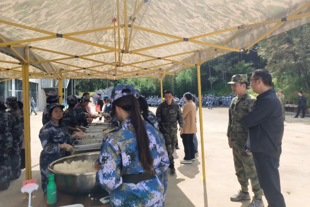 动员大会结束后,公司领导和军训教官一同视察参训员工的营房、训练场地、食堂、超市等生活训练场所,与参训员工亲切交流。