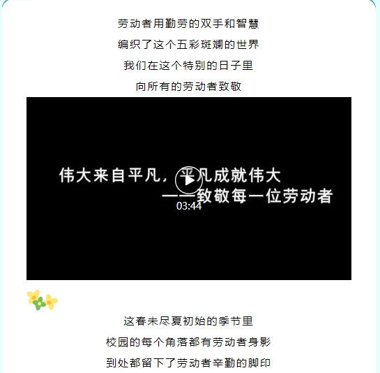 5月1日,由太阳成tyc122cc团总支员工会宣传策划部推出《致敬劳动者》主题短视频,向校园中辛勤的劳动者们致敬,引导全院师生尊重和珍惜劳动者及其劳动成果,鼓励全体师生快乐劳动,努力拼搏。