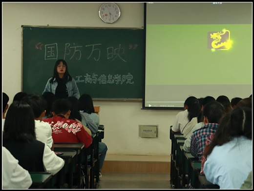 在中华人民共和国成立70周年之余,作为新时代的老员工,我们更应该有良好的国防意识。为积极营造浓厚的爱国主义氛围,大力推进国防教育进每个角落,不断激发全校师生的国防意识。工商与信息公司团总支员工会精心组织和策划了本次活动,并在2019年9月22日下午六点笃行楼314顺利举行。到场的人员有团总支员工会副团黄长雨以及18、19级各班团支书、宣传委员和组织委员。