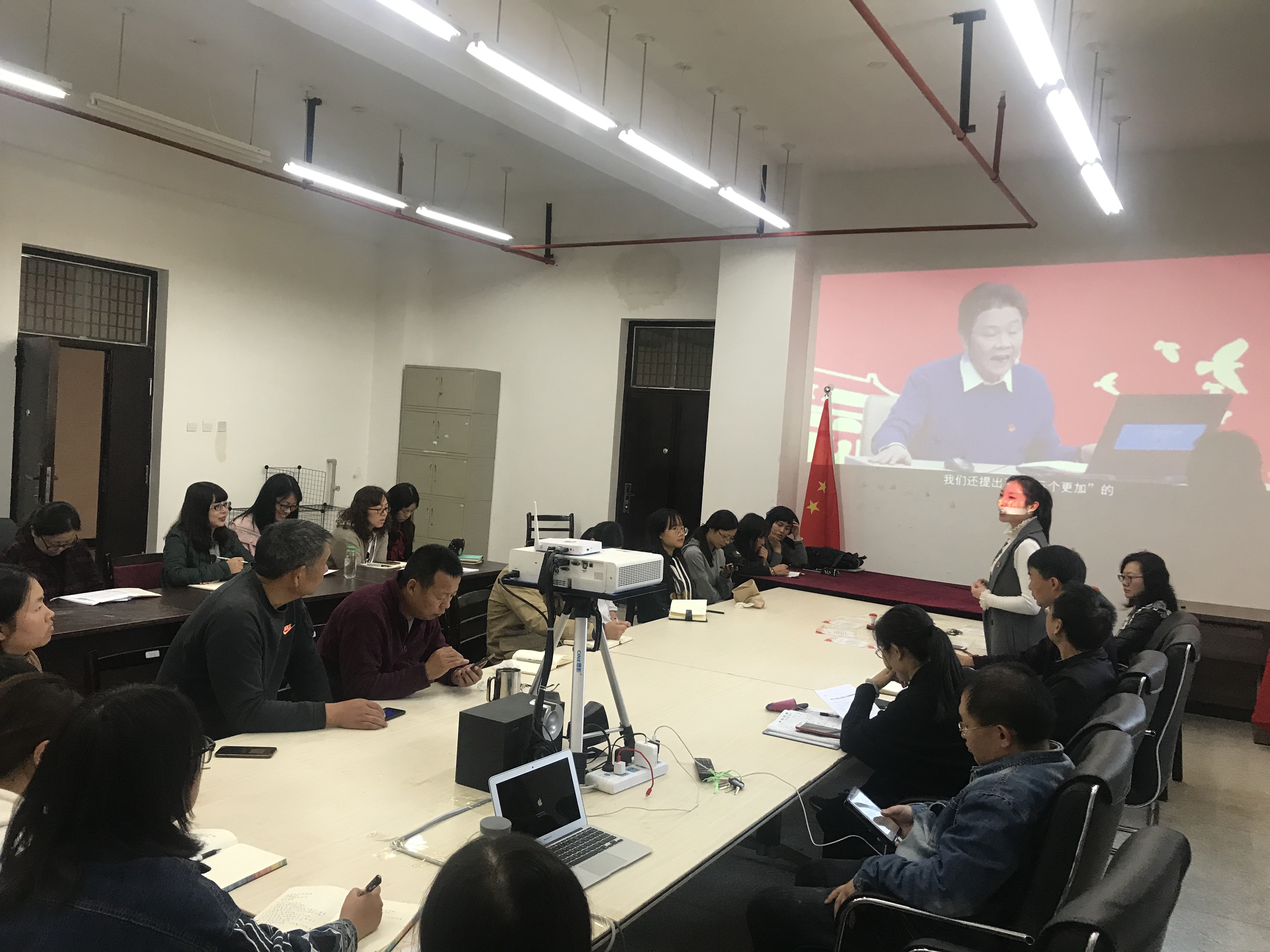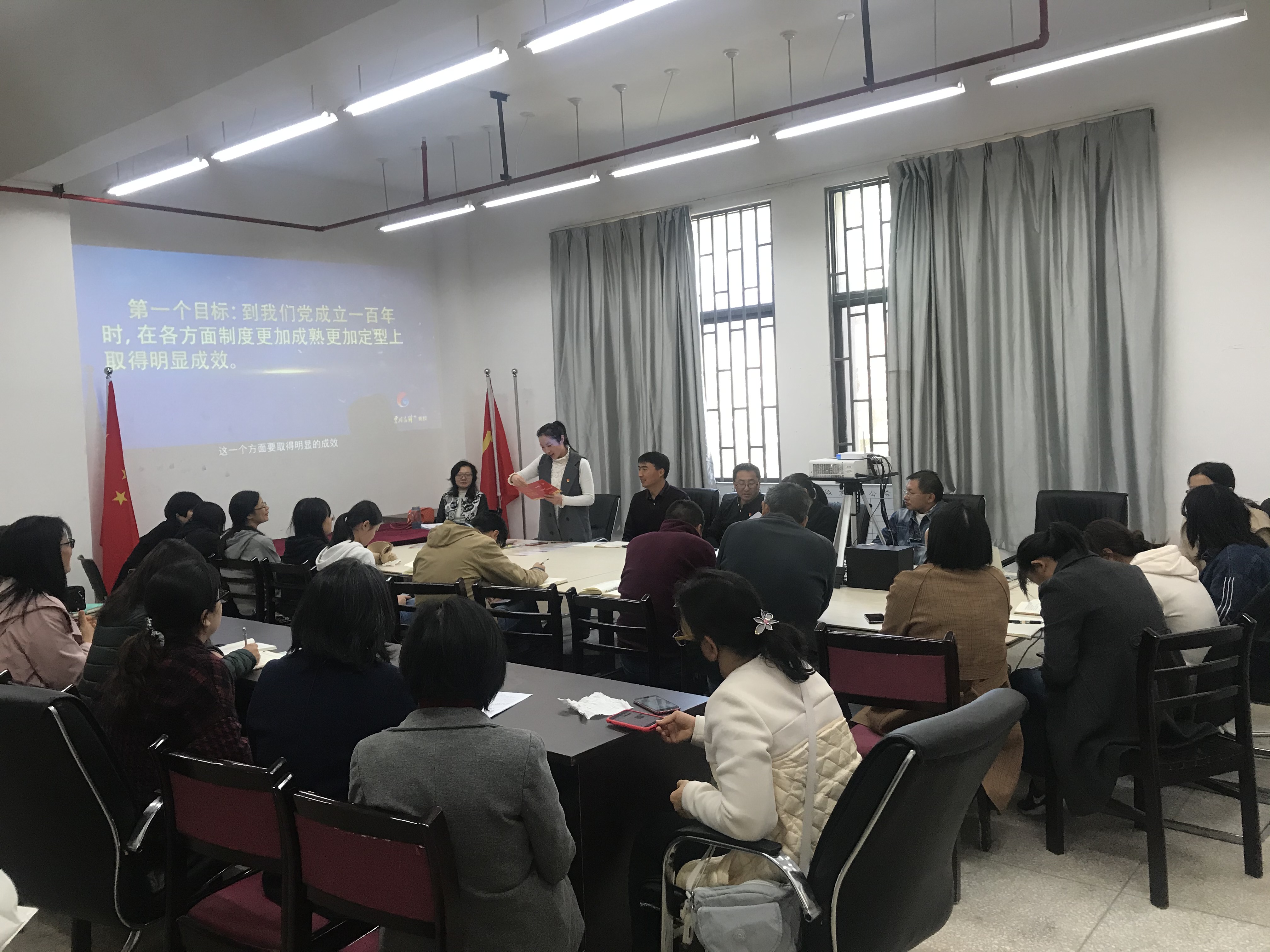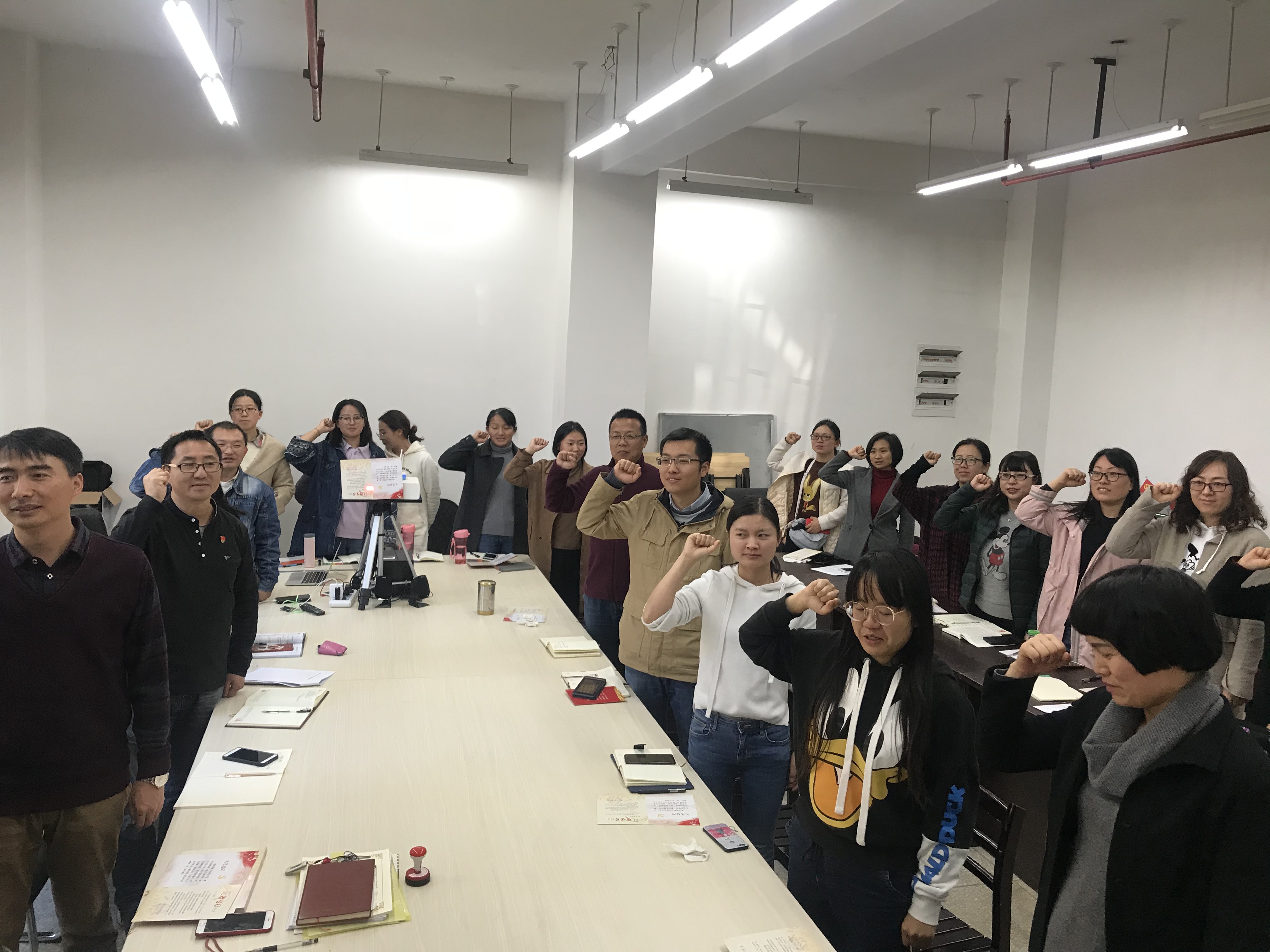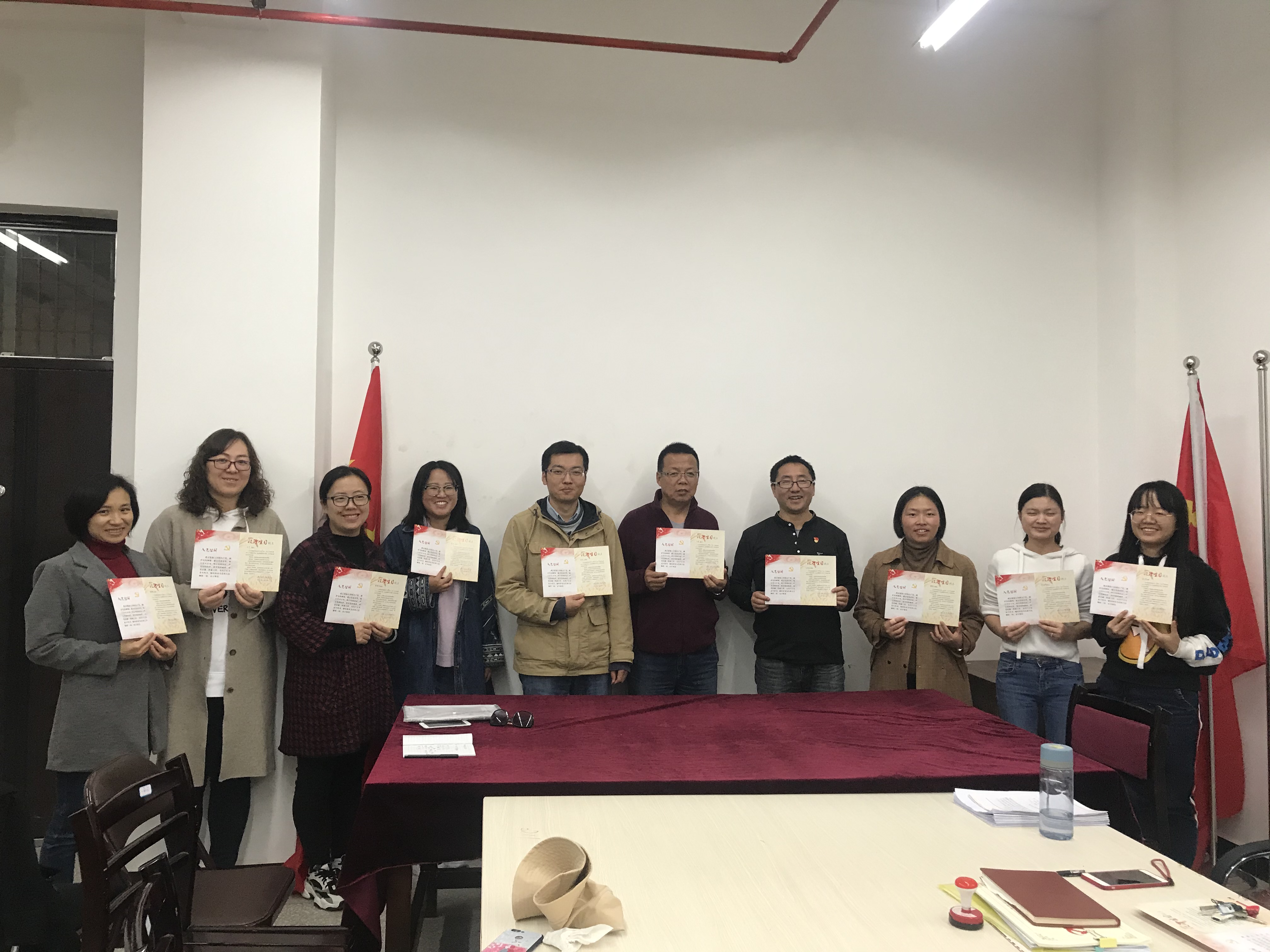 2019年11月29日12点40分工信党支部在勘物楼211组织党员过政治生日和学习十九届四中全会精神。工信党支部所有党员参会。