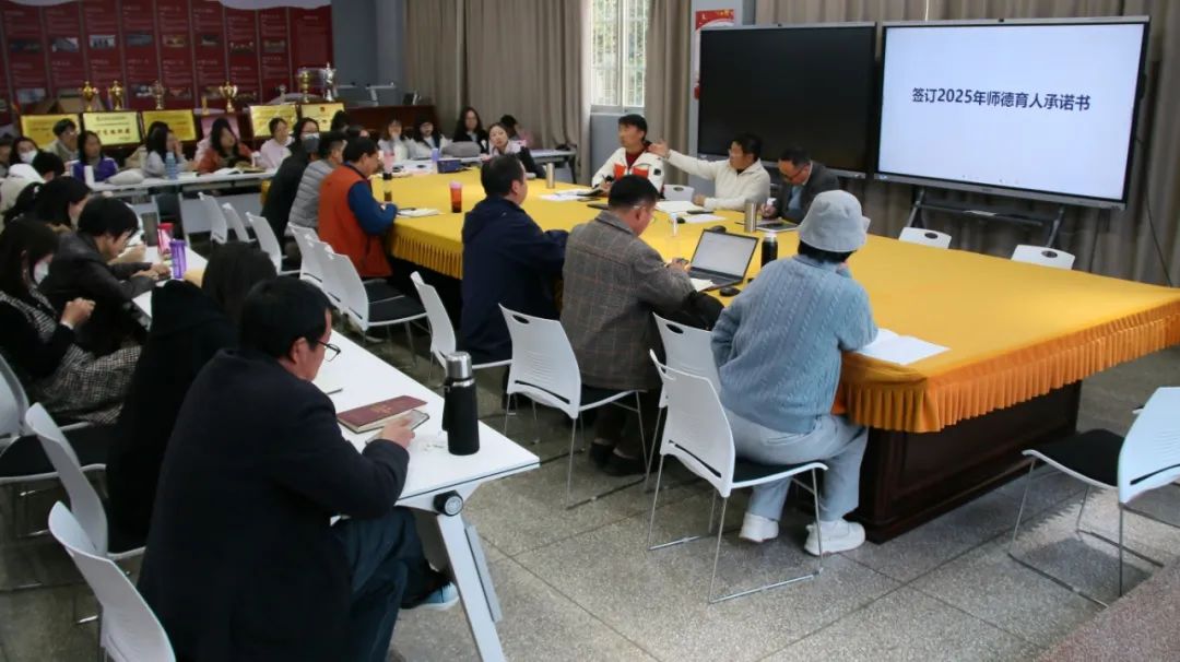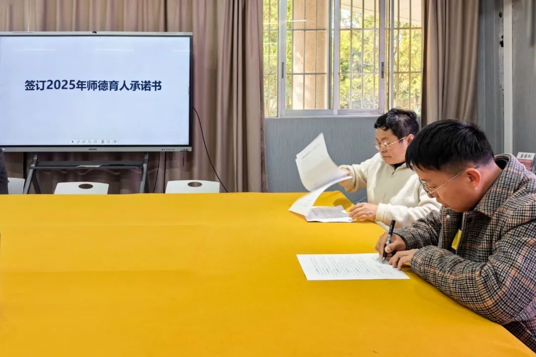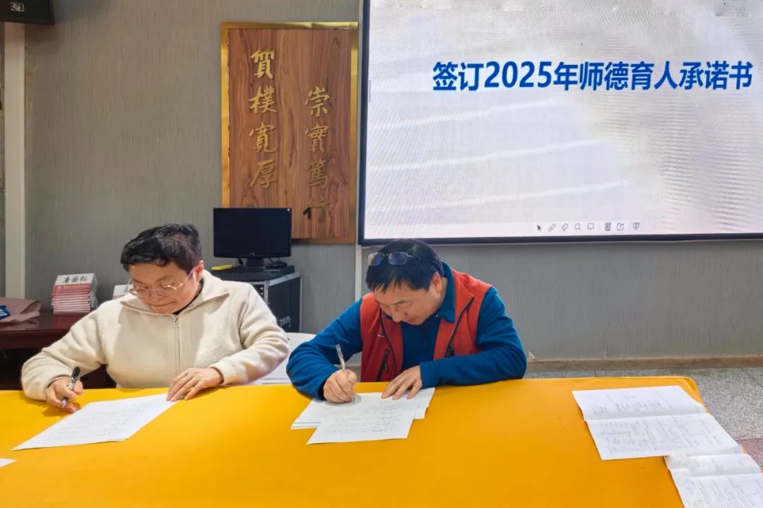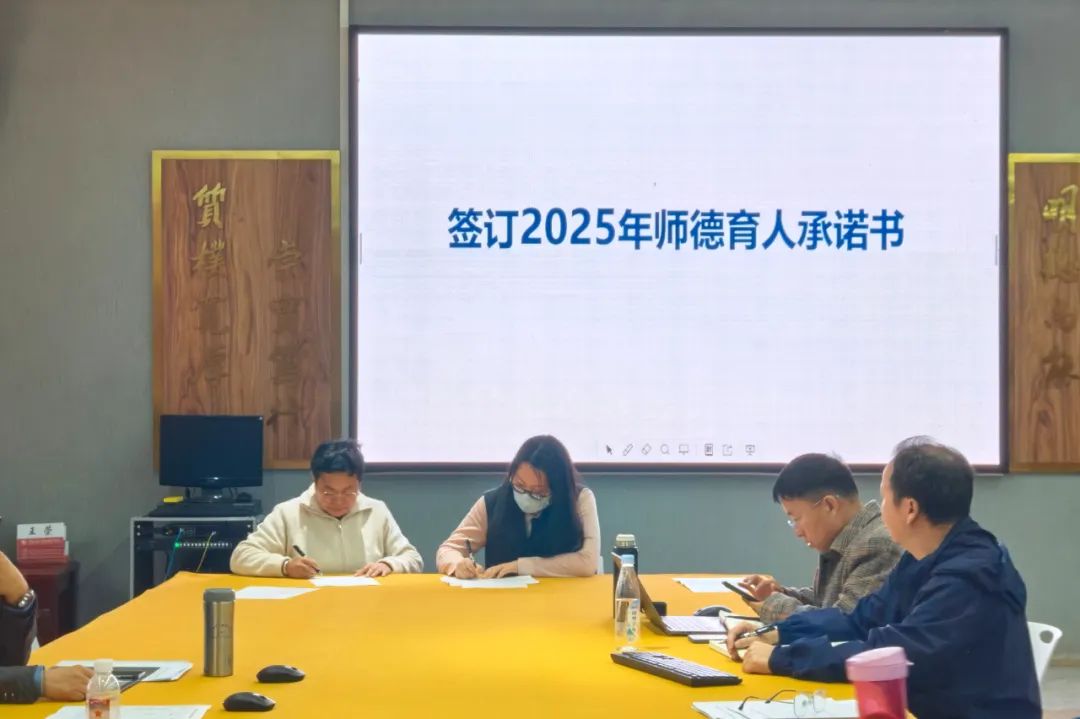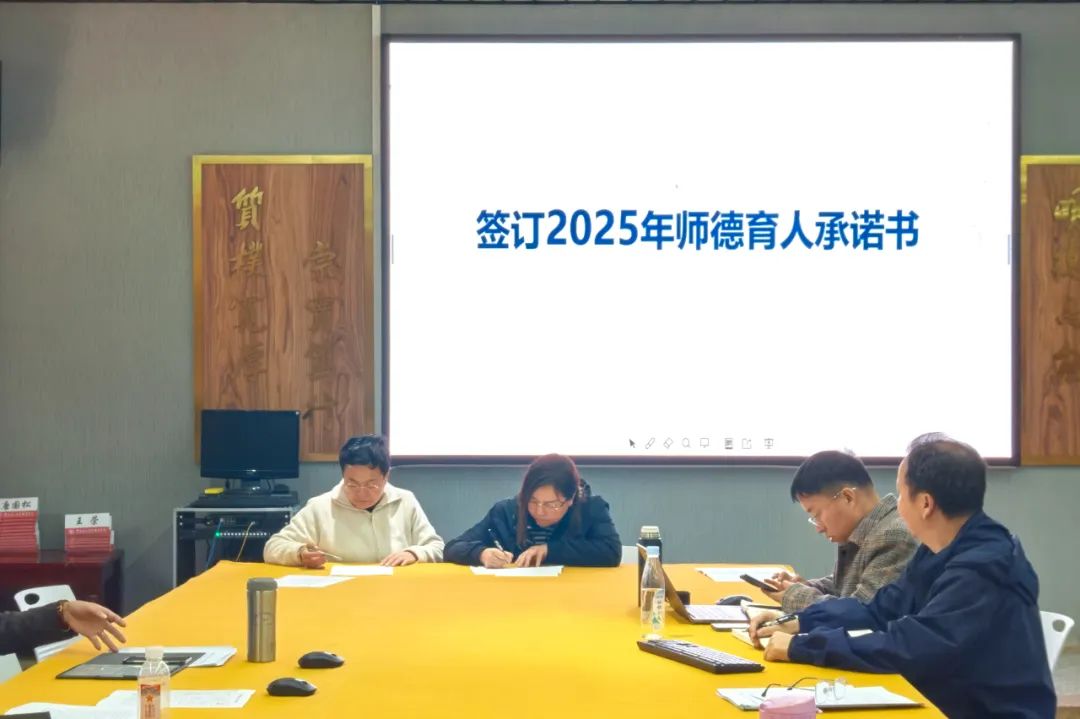 会议最后,方荣书记带领全体教职工开展师德师风专题警示教育,通过典型案例剖析,重申《新时代高校教师职业行为十项准则》铁律,要求全员以德立身、以德施教,在学风教风、人才招聘、学术研究等重点领域拧紧思想“安全阀”。全体教师现场签署《2025年师德育人承诺书》,以庄重仪式强化责任担当。