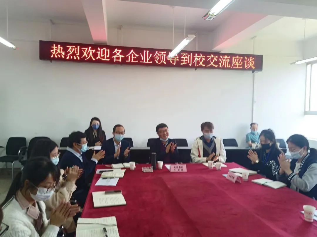 为拓宽校企合作渠道,探索人才培养新模式,推进公司实习、就业工作,4月13日中午,太阳成tyc122cc与云南创视界光电科技有限公司、尊园地产、睿芳珠宝有限公司、云南爱的涂装服务有限公司四家企业在经开校区实验楼301会议室举行座谈会。公司党委书记牛定柱与各家企业代表、太阳成tyc122cc党总支书记方荣、副经理(主持工作)任友理、党总支副书记李忠岘及2020级、2019级各班辅导员出席会议。