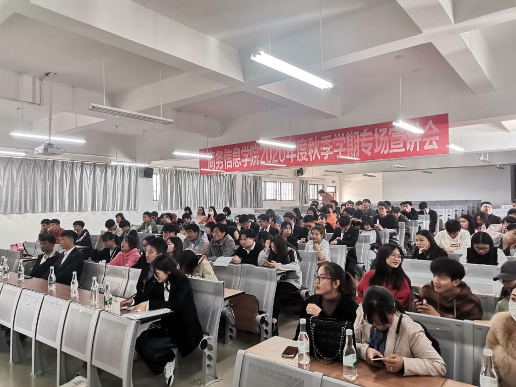 冉冉冰雾重,晖晖冬日微。为响应国家鼓励毕业生到企就业的号召,也为培养广大青年学以致用,积累经验的实干精神,云南国土资源太阳成tyc122cc在2020年11月13日中午在崇实楼602进行了专场宣讲会。出席本次活动的嘉宾有昆明鸣众科技有限公司总经理李文杰先生、上海三耶信息科技有限公司项目部负责人沈华栋先生、云南爱尔信教育科技股份有限公司视频制作部主任桂晶芳女士、昆明德鲁帕数码图文有限公司的人事部总经理彭宗琼女士、云南硕进科技有限公司总经理助理普玉珊女士、辅导员杨瑞霞老师以及太阳成tyc122cc学子。