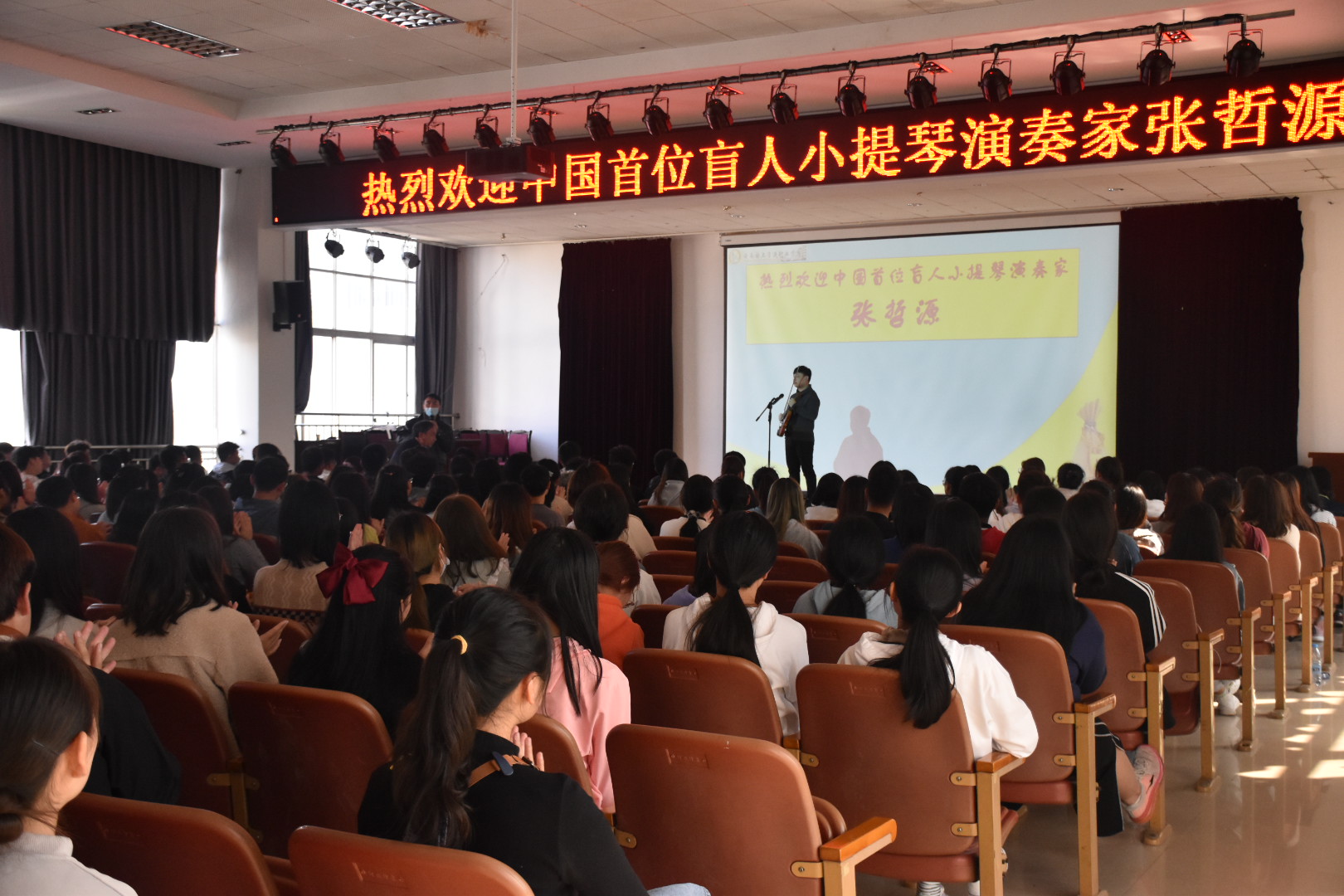随着主持人李忠岘老师对中国首位盲人小提琴演奏家张哲源先生的简单介绍,本次讲座正式开始。首先,他用一句话展开了自己的成长史序幕,“我就是我,不一样的烟火”。这句话让我们感受到了一股强烈的能量冲击,让我们瞬间能量满满。紧接着他开始了职业选择的自述,99%的盲人都选择按摩这个行业,而张哲源先生却是那1%,这需要多么大的勇气才能做到。张哲源先生还提到学力比学历重要,每天需要做的事情就是自省,他不断的激励自己往前走,向上走是需要一个沉淀的过程,由此可见张哲源先生磨而不磷,涅而不缁的坚贞德操。随后还分享了自己艰难时光如何度过的经历,告诉我们心里要永远有自己一个希望的终点,人生是一场单程马拉松,没有回头路。最后通过问答的方式与同学进行密切的交流,本次讲座于现场演奏中国古典音乐《渔舟唱晚》圆满结束。同学们积极与张哲源先生以及老师合影留念。