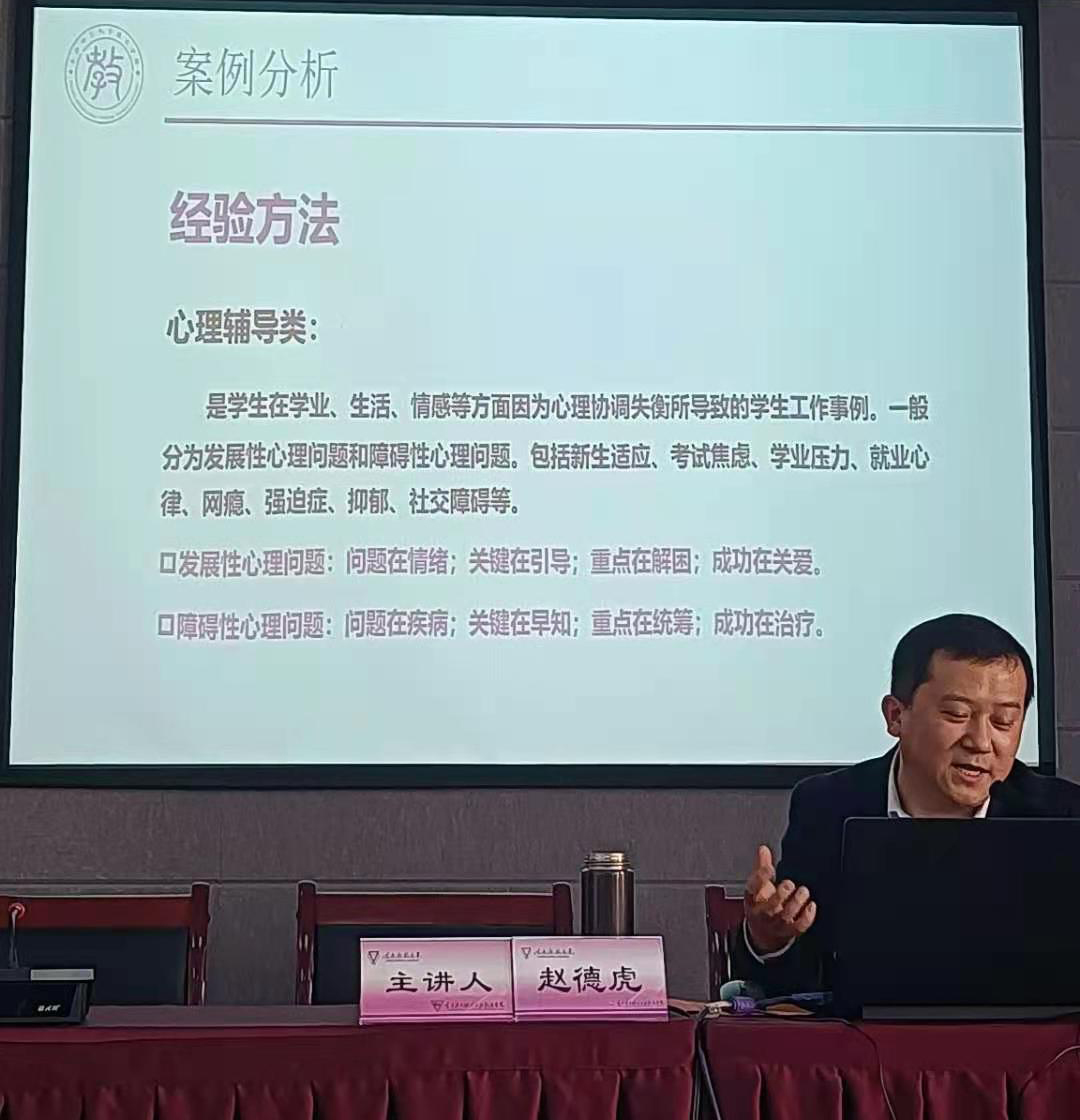 本次专题培训班结合《马克思主义为什么是对的》、《高校辅导员素质能力大赛视野下辅导员核心素养提升》、《高校员工突发事件应急处置策略》、《教育要同国家之命运,民族之前途联系起来——深入学习习近平总书记考察西南联大旧址重要讲话精神》、《老员工心理危机识别与干预》、《高校辅导员心理调适与解压》等多个专题辅导,从辅导员工作中坚持的思想武器、新形势下辅导员核心素养的要求及其提升、突发事件的处理以及辅导员实务工作中的技能和方法等多个方面进行讲解和研讨。