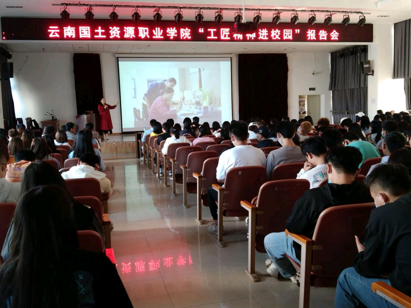 报告会伊始,李忠岘副书记强调了工匠精神对个人成才、社会发展的时代意义,并介绍了孙鸿雁教授的有关事迹。孙鸿雁教授曾获得“云南省劳动模范”、“云南省五一劳动奖章”,“昆明市五一劳动奖章”,“云南省技术能手”,“云南好人”,“昆明市道德模范”,“昆明市突出贡献高技能人才”等多项荣誉,创立了孙鸿雁技能大师工作室、云岭工匠创新工作室、孙鸿雁技师工作站、巾帼创新业示范基地、昆明工会先锋号、劳模创新工作室。作为云南省工艺美术大师,中国内画艺术大师的孙鸿雁教授从事内画艺术创作二十八年,创立了独具云南民族特色的“滇派内画技艺”,填补了云南工艺美术的空白,同时建立了云南鸿雁内画艺术研究院、滇派内画艺术传习馆,作品获得国际、国家和省级奖项60余项,4件作品被国家、省级博物馆收藏。