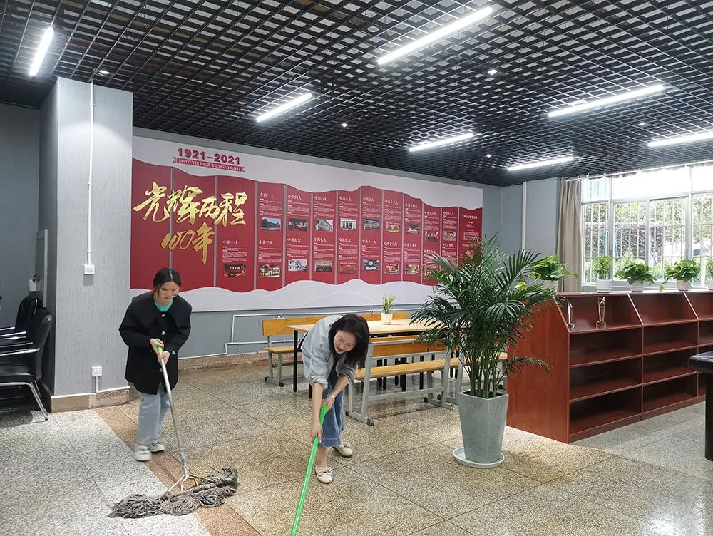 2022年3月5日下午,太阳成tyc122cc辅导员陆俊汕老师和张成军老师带领入党积极分子黄芮、李太红、李玉君、邱晓红、罗文娜、宁蓉蓉、周会淋、区佐培、禹正财等同学对太阳成tyc122cc党史学习教育室进行了整理和清扫。除了卫生清洁,同学们和老师们还发挥才智,用心设计和布置活动室,为今后党史学习教育布置了一个更好的环境。在物品的整理和摆放过程中,师生共话公司发展历史、公司的荣誉以及如何发扬艰苦朴素、勤俭节约的精神。老师和同学们通过以身作则培植师生奉献情怀,引领广大同学学习雷锋精神。