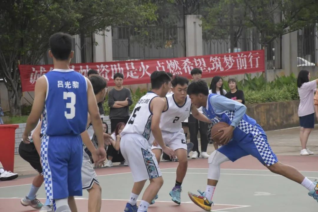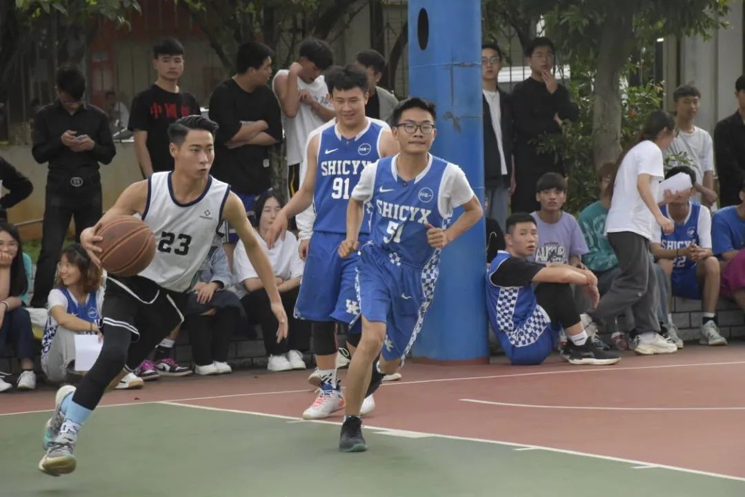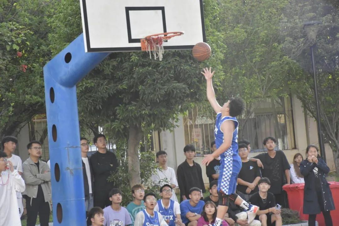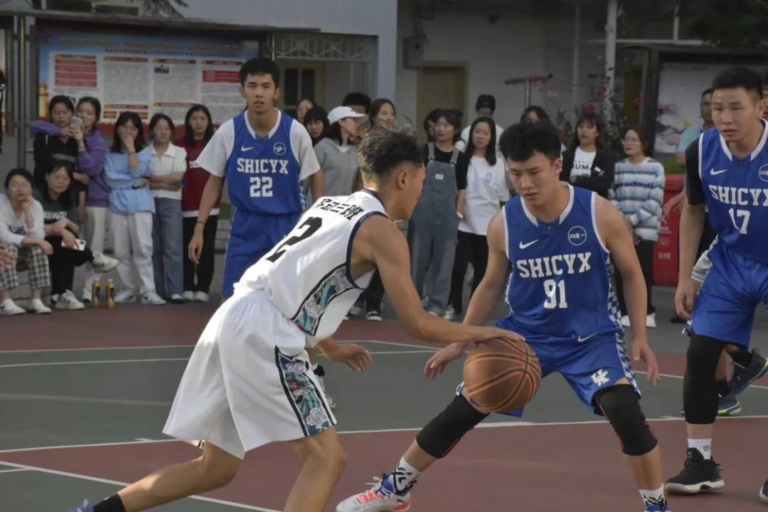 6月9日17:30,球员们已经到场做好赛前准备活动。随着裁判的哨响,整个球场就充满了紧张的气氛,双方球员的激情全都淋漓尽致的体现在篮球场上。比赛进程中,各位队员都全力以赴,积极防守、积极进攻,越战越勇,显示了他们极佳的心理素质。在场同学也情绪高涨、摇旗呐喊,不时为队员打气、喝彩,气氛热烈。赛场上的,双方拼抢很激烈,带球、运球、投篮一系列动作潇洒、规范,引来围观同学一阵阵地喝彩。