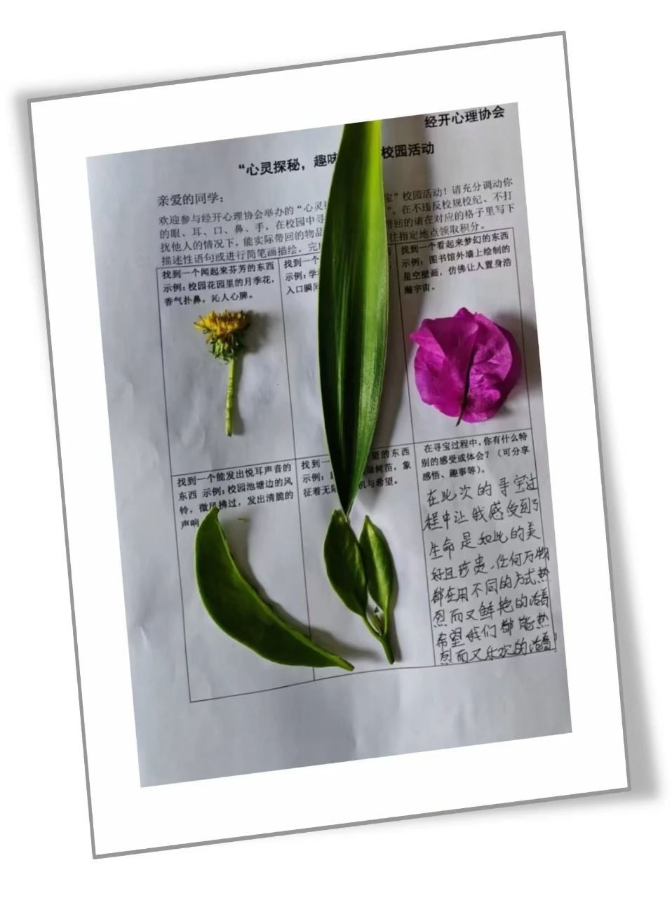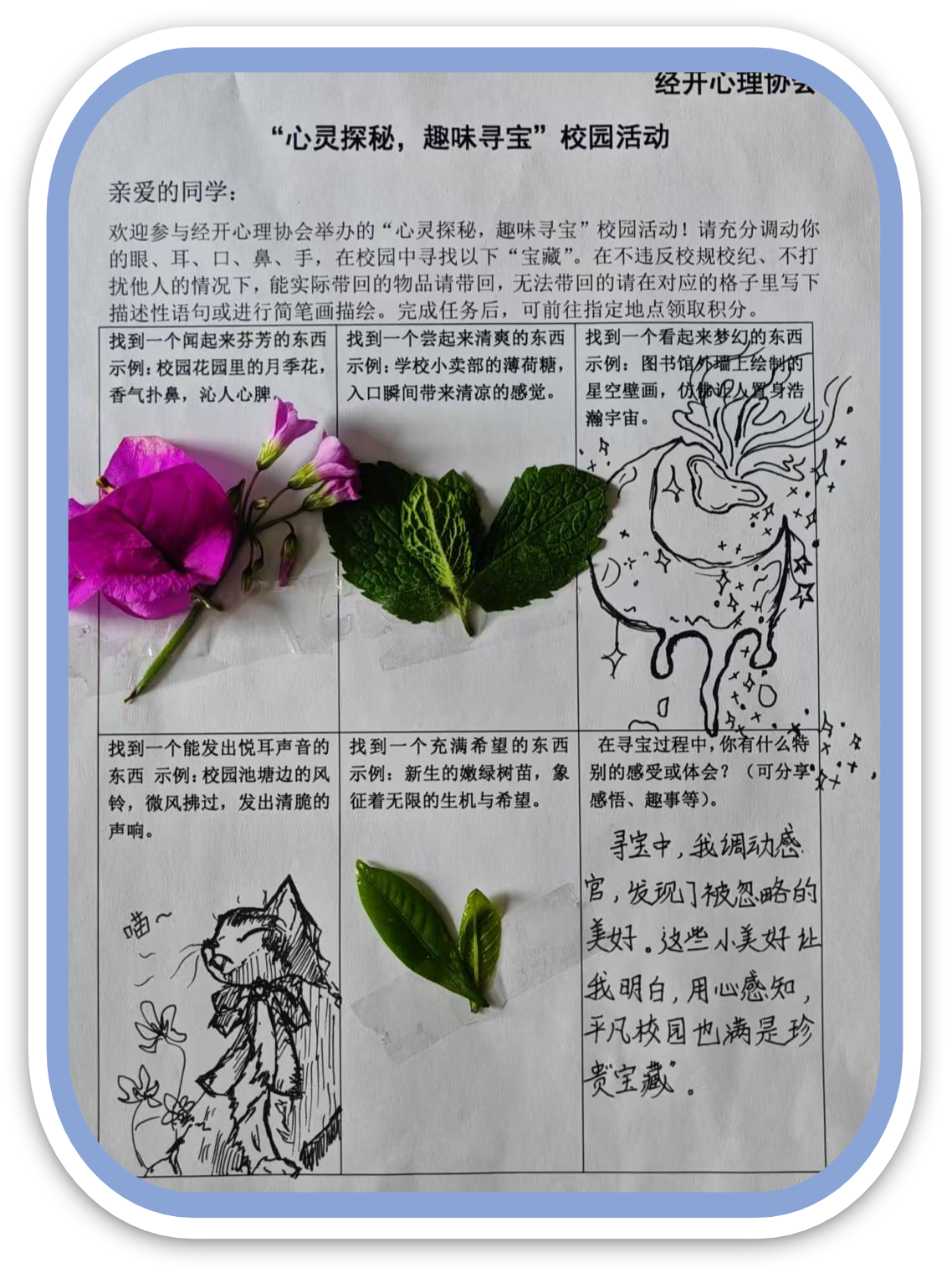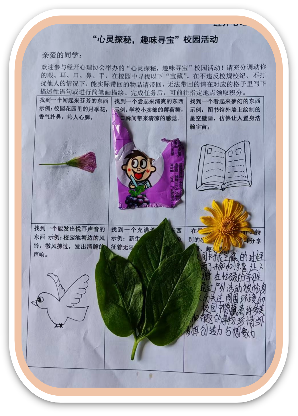 活动当日,同学们热情高涨,踊跃投身这场“心灵探秘,趣味寻宝”之旅。他们穿梭于教学楼回廊、花园幽径等各个角落,调动视觉、听觉、嗅觉等感官,在熟悉的校园里探寻别具意义的“宝藏”。这里有馥郁芬芳的花朵,暗香浮动;有清爽可口的薄荷糖,入口清甜;有梦幻绮丽的星空壁画,将浩瀚宇宙凝于方寸之间;还有象征着生机与希望的嫩绿树苗,诉说着生命的蓬勃。
