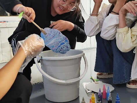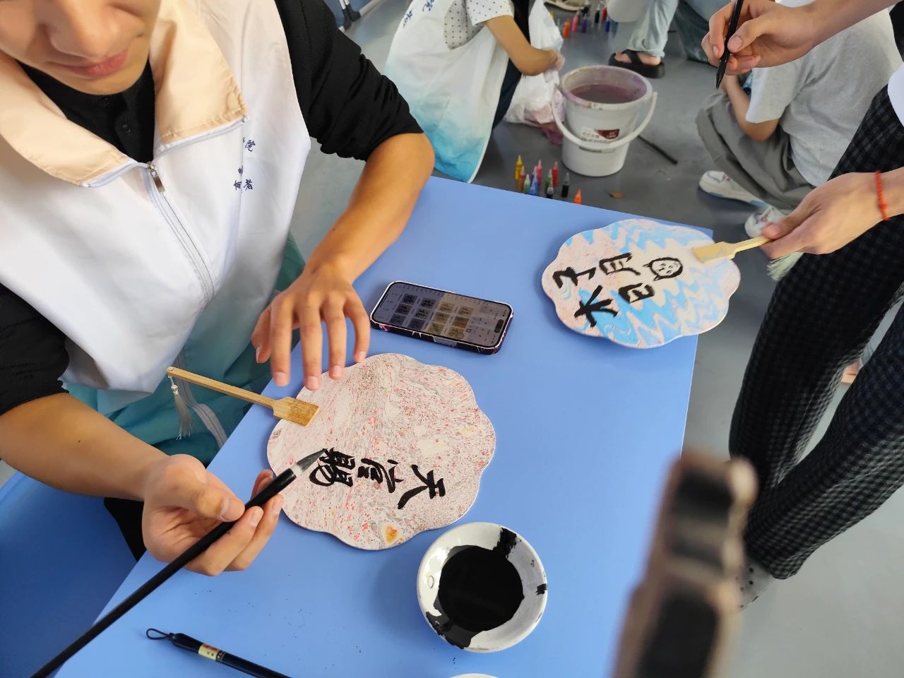 讲解结束后,同学们迫不及待地投入到漆扇制作中,相互分享着自己的创意和想法,小心翼翼地用笔在扇面上轻轻晕染,经过一番精心创作,原本素净的扇面逐渐变得五彩斑斓,各具特色。在制作过程中,他们学会了耐心和专注,提高了自己的审美能力和动手能力。