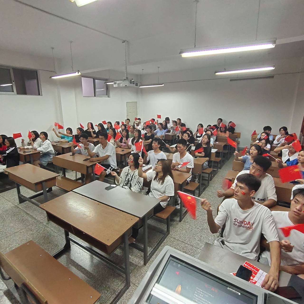 随着音乐的缓缓奏起,全体同学纵情高唱《我和我的祖国》。满腔爱国热情和自豪感随着胸腔的共鸣无限延伸,同学们用歌声表达着对祖国母亲最深沉的爱意。