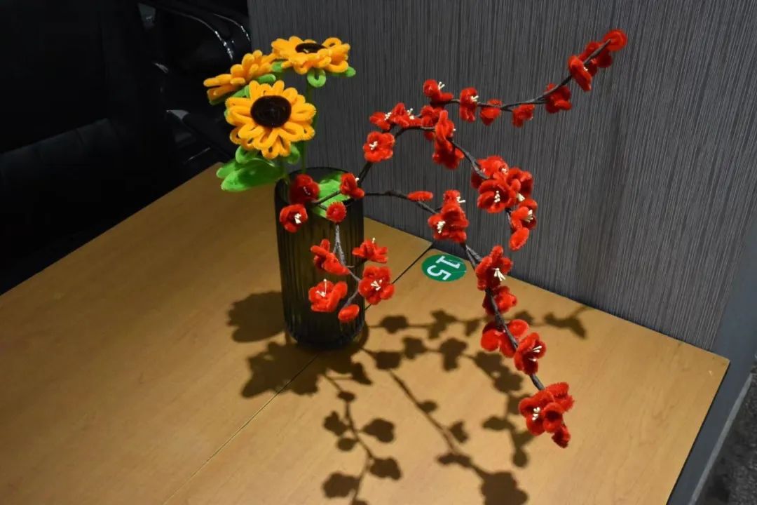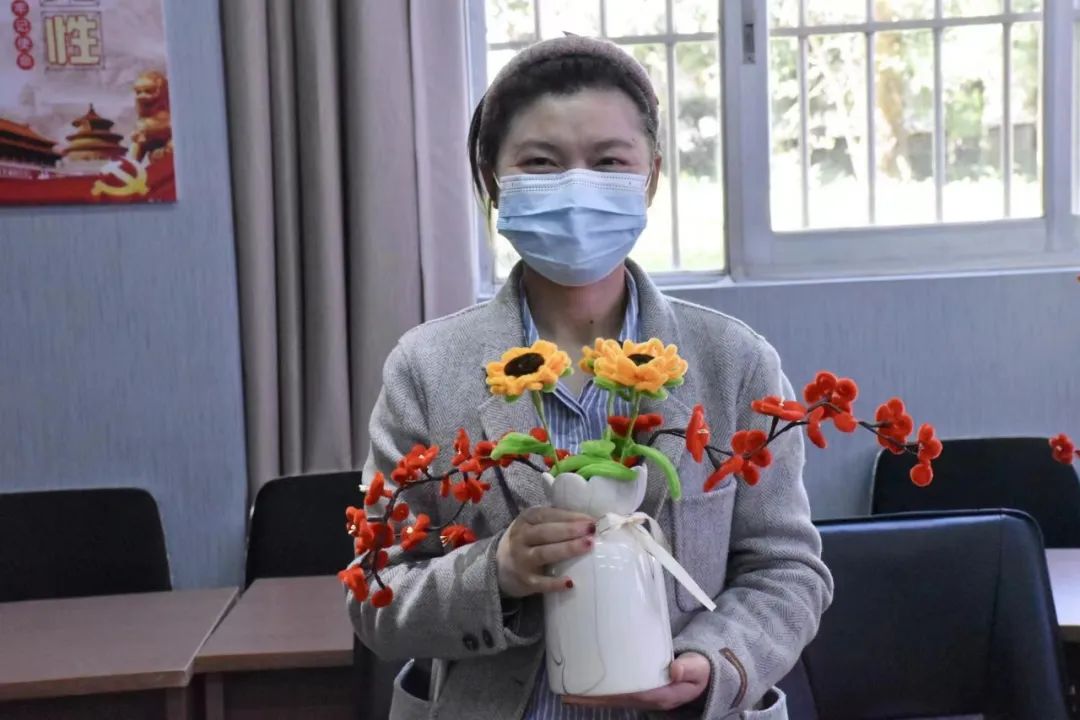在志愿者的耐心指导下,老师们通过折、扭、捋等操作,将一条条红色的绒条变身成了一片片腊梅,黄色的绒条变身成金色的向日葵,再将它们捆绑、修整到一起,娇艳的花朵在老师们的指尖绽放。