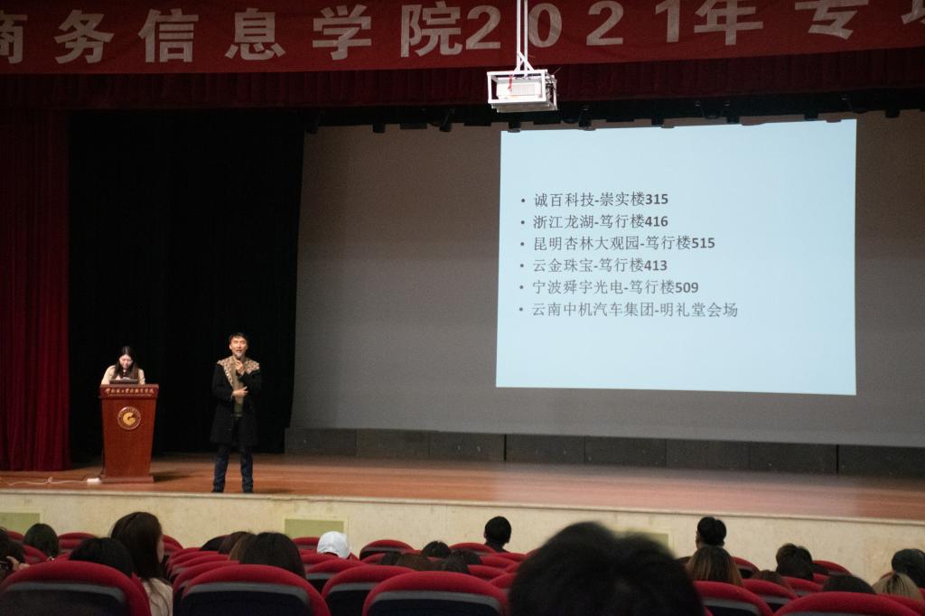 2021年4月8日中午12:30,太阳成tyc122cc组织开展了2021年度专场招聘会,为进一步做好就业工作奠定了基础,为下一步招聘会的陆续开展拉开了帷幕。公司副书记李忠岘同志到会致辞。云南诚百科技有限公司、浙江龙湖集团(龙湖智慧服务)、云南中机汽车集团、昆明杏林大观园健康产业(集团)有限公司、云南云金珠宝股份有限公司、宁波舜宇光电信息有限公司分别作了宣讲。