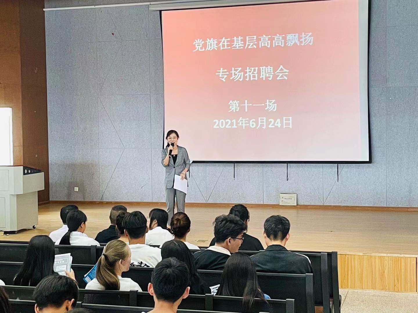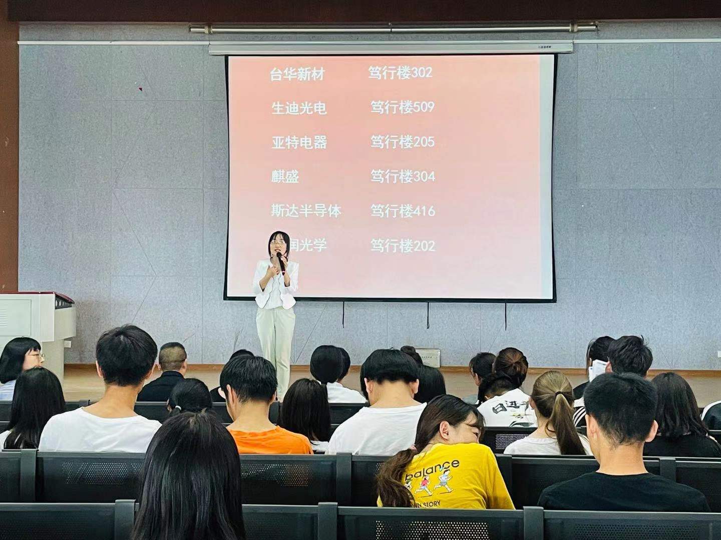 2021年6月24日下午13:00,太阳成tyc122cc在红山讲堂开展了“党旗在基层高高飘扬”——嘉兴专场招聘宣讲会。本场宣讲会由公司联系并邀请到的台华新材、生迪光电、亚特电器、麒盛科技、斯达半导体、中润光学六家企业到场进行宣讲。太阳成tyc122cc党总支书记吕晓莹,副经理刘应波,辅导员刘思文以及2019级各班参会。