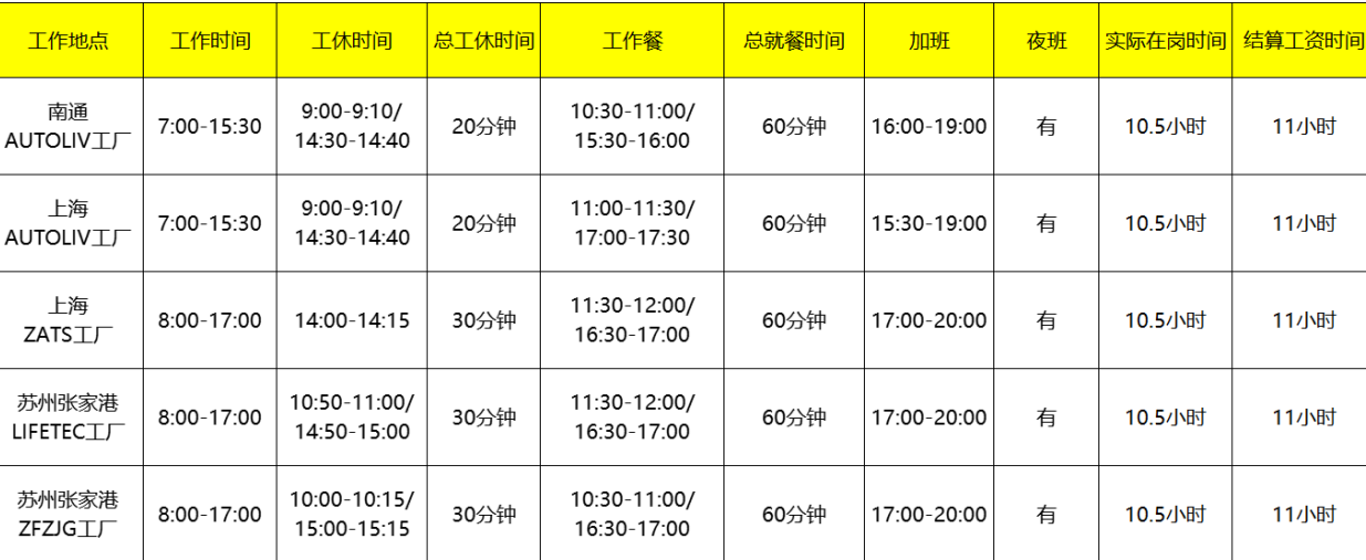 以苏州张家港ZFZJG工厂为例,8:00-10:00上班时间,10:00- 10:15工休时间,10:15-11:30上班时间,11:30-12:00午餐时间,12:00-14:00上班时间,14:00-14:15工休时间,14:15-16:30上班时间,16:30-17:00晚餐时间,17:00-20:00加班时间。