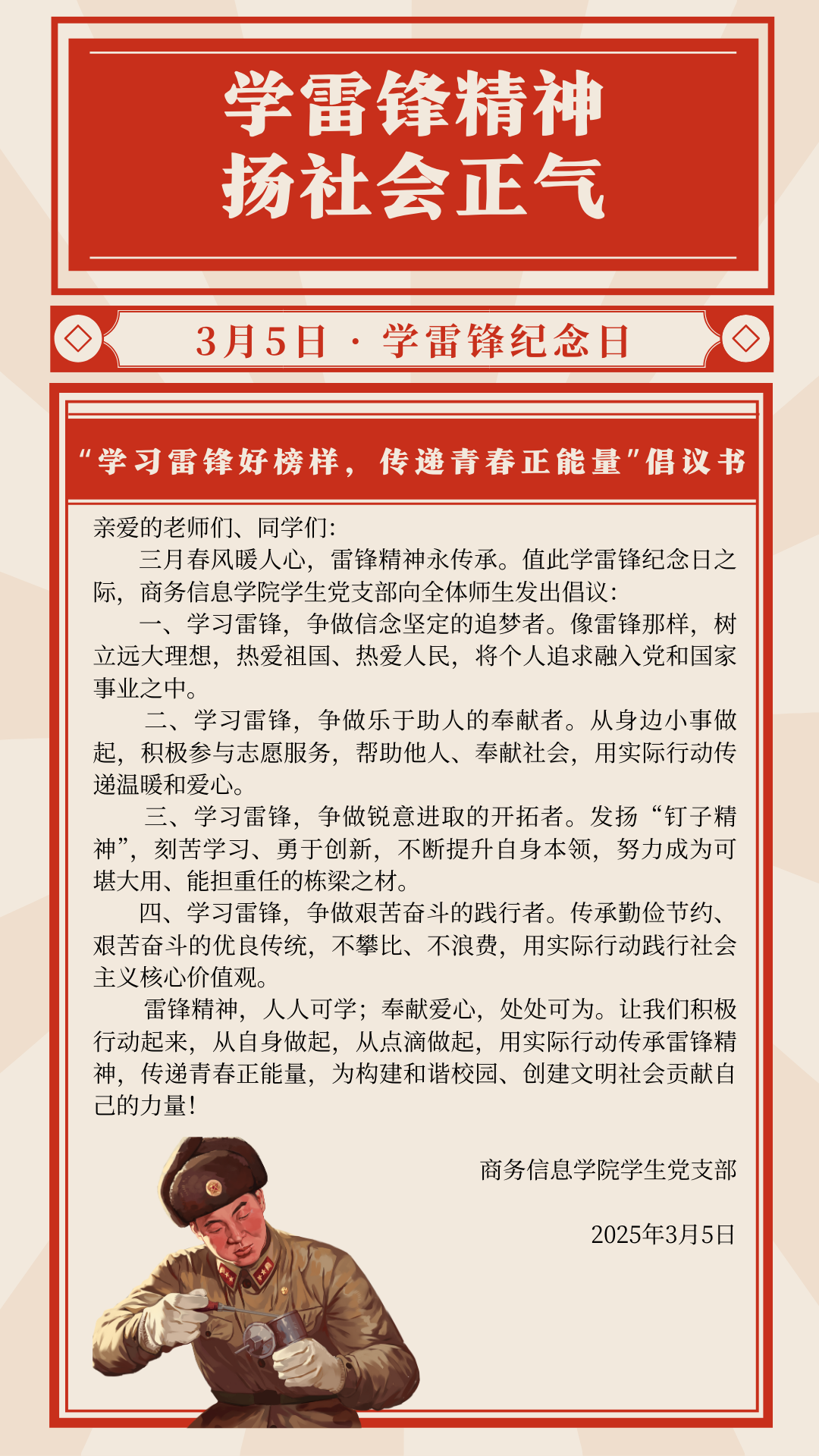 此外,支部还向广大师生发起了“学习雷锋好榜样,传递青春正能量”的倡议,号召大家从自身做起,从身边小事做起,积极参与志愿服务活动,用实际行动传承雷锋精神,争做新时代雷锋精神的传播者、践行者。